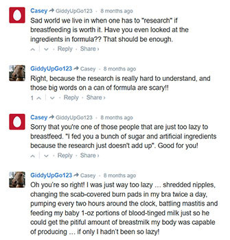 For self-secreted experts in all human biology, they don't seem to understand that people are different. Some people don't breastfeed, or can't breastfeed, for any of an array of reasons far too personal to get into with someone who's decided that "Mother feeding their child" is a valid target for public assault. There are orc tribes sneaking up on hobbits with better ethics.